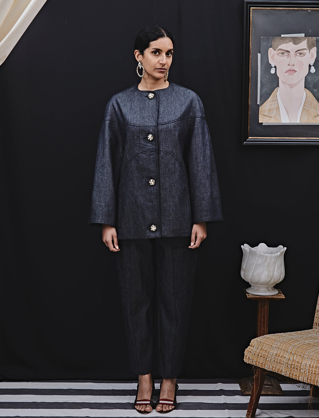 A fresh take on denim through impeccably coordinated pieces. Thoughtfully designed with embellished buttons and distinctive silhouettes, these garments bring a subtle touch of glamour to the utilitarian essence of denim. Their rich tones and bold, contrast stitching evoke classic workwear—reimagined with elevated detail and modern polish.